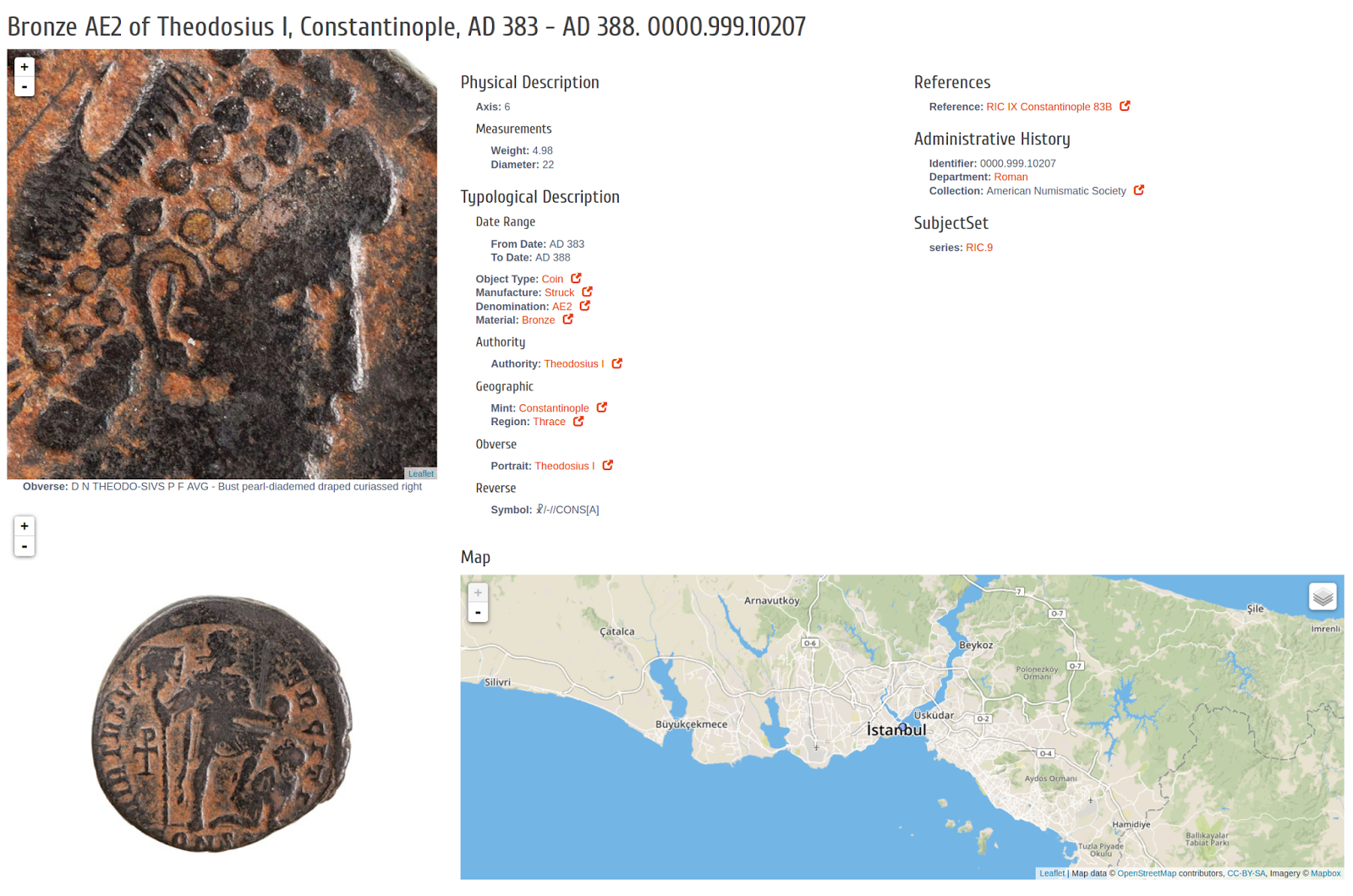 - If there's a mets:file[@USE='iiif'] detected when rendering the HTML page for an object, the obverse and reverse IIIF services are rendered with Leaflet (above)